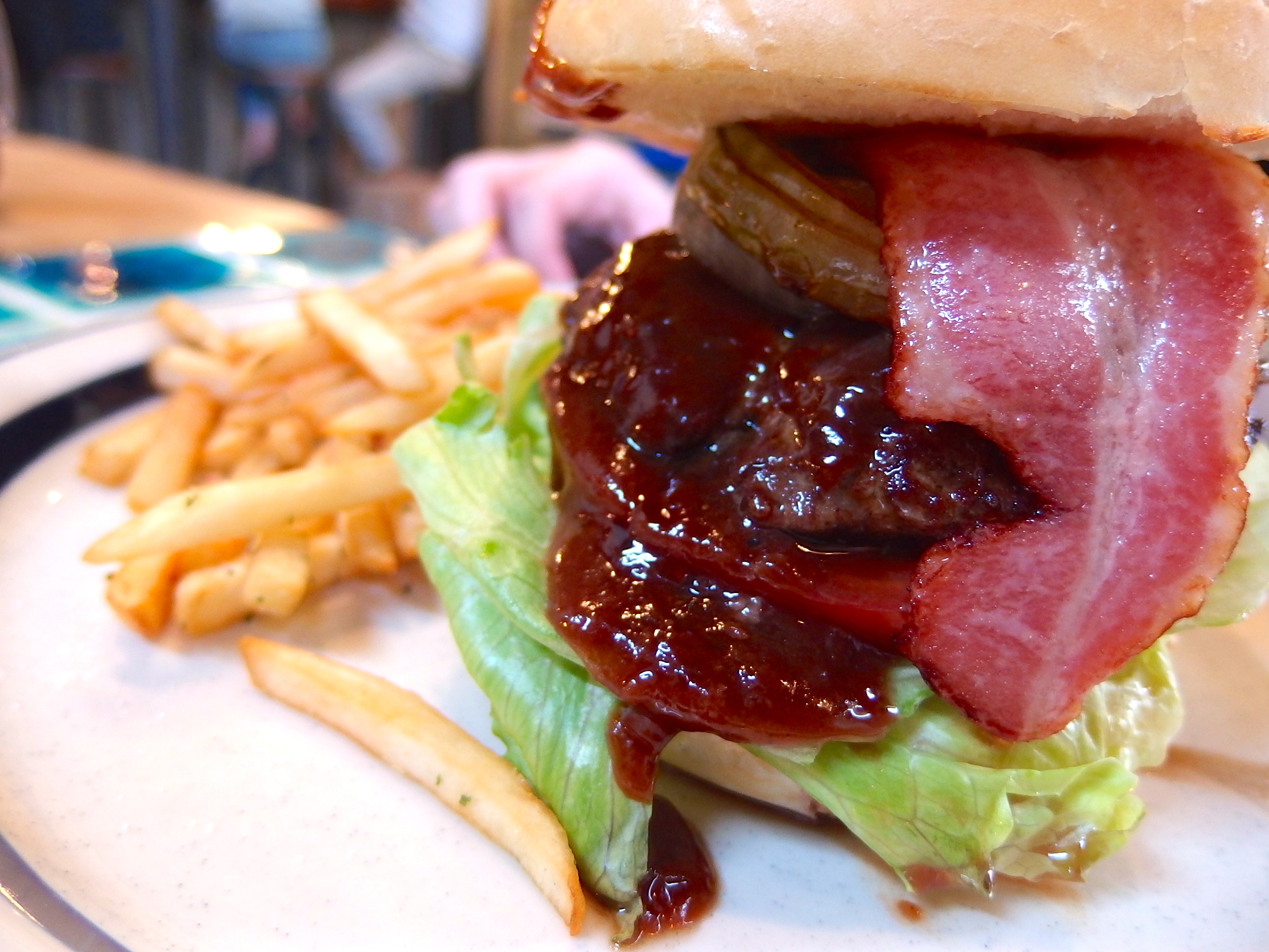 スモーキーチーズバーガー、1250円なり。ソースがたれまくるこの迫力!