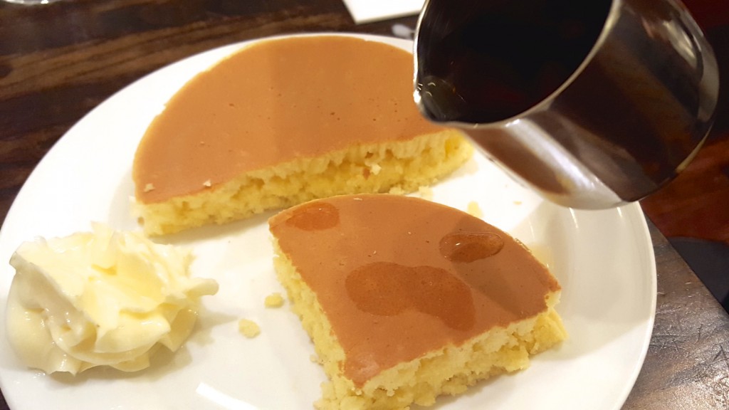 なんと、今日はホットケーキサービスデー!午前11時から午後8時までは、食事、飲み物と一緒にホットケーキを注文すると、150円でホットケーキを追加できる!